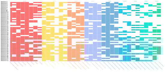 Figure 1 provides a visual representation of the ‘transition card’ of initiatives (y-axis) and their associated Focus Area characteristics (x-axis). The visual representation identifies gaps and opportunities from a set of unlinked community-based initiatives. As seen by the uncoloured cells, and as presented in Table 2, initiatives were least likely to possess characteristics within Focus Areas 6–9, which focused on the community–government interface. Example characteristics included government staff working with community groups through a committee, or investigating how the government could support initiatives that were addressing the objectives in the government Strategic Plan. Each initiative owner received an individual summary report highlighting their associated row within Figure 1.
