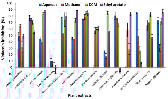 All four extracts of Glycyrrhiza glabra and Melissa officinalis (lemon balm), and three out of four extracts of Mentha piperita (mint), Syzgium anisatum (aniseed) and Zingiber officinale (ginger) inhibited the QS of C. violacein by more than 80%. Higher AQS activity was obtained for Glycyrrhiza glabra, Armoracia rusticana, Rosmarinus officinalis, Thymus vulgaris, Curcuma longa (turmeric), and Melissa officinalis in the quantitative violacein inhibition assay as compared to the qualitative assay. Only Glycyrrhiza glabra (aqueous and methanol extracts), Armoracia rusticana (aqueous extract), Rosmarinus officinalis (ethyl acetate extracts), Thymus vulgaris (methanol and ethyl acetate extracts), and Melissa officinalis (methanol extract) displayed potential AQS activity in the qualitative assay. However, almost all of the extracts exhibited some degree of AQS activity. Curcuma longa displayed no AQS activity when it was determined using the qualitative assay; however, more than 80% activity was observed for the ethyl acetate extract in the quantitative assay. This suggests that the qualitative agar well diffusion assay may not be an appropriate technique to judge AQS activity. A quantitative assay should be accepted as the standard to eliminate the discrepancy between the two methods.