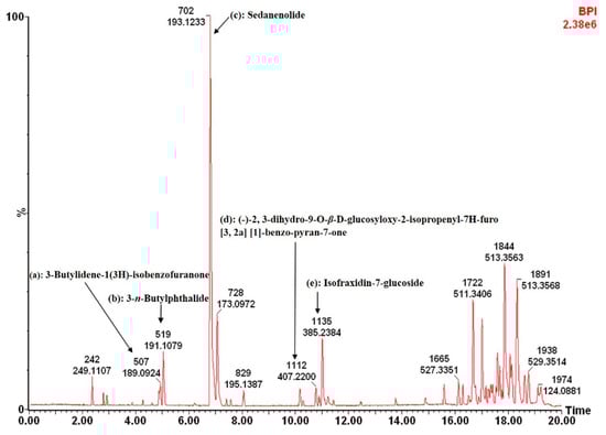 The UHPLC-MS profile of the ethyl acetate crude extract revealed seven compounds, which were identified as (a) 3-butylidene-1(3H)-isobenzofuranone [56]; (b) 3-n-butylidene-phthalide [57]; (c) sedanenolide [57]; (d) (-)-2,3-dihydro-9-O-β-D-glucosyloxy-2-isopropenyl-7H-furo[3,2a][1]- benzo-pyran-7-one [58]; (e) isofraxidin-7-glucoside [59] and sedanenolide (3-n-butyl-4,5-dihydrophthalide), after comparison of their spectral data with data reported in literature (Figure 2). Phthalide compounds have a broad distribution and are prevalent in Apium graveolens. As example, Tang et al. [57] documented two major phthalide compounds, namely 3-n-butylphthalide (sedanolide) and 3-n-butyl-4,5-dihydrophthalide (sedanenolide) in Apium graveolens oil. These butylphthalides have been recognised for their physiological activities including anti-inflammatory, anti-carcinogenic and insecticidal effects [60].
