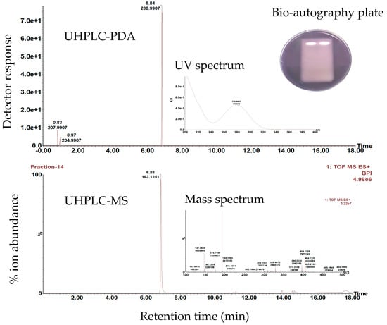 Ultra performance liquid chromatography (UHPLC)-photodiode array (PDA) and UHPLC-mass spectrometry (MS) chromatograms of sedanenolide, isolated from the ethyl acetate crude extract of Apium graveolens. The ultraviolet absorbance spectrum and mass spectrum are also provided. The high performance thin layer chromatography (HPTLC)-bio-autography plate of pure sedanenolide (in duplicate) against Chromobacterium violaceum is also indicated with the white zones confirming the anti-quorum sensing activity of the compound.