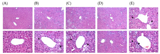 Hepatic histopathology of hamsters fed an HFD after a melatonin (MEL) intervention for eight weeks (200× magnification): (A) Control with a regular diet, (B) HFD without MEL), (C) HFD with 10 mg/kg MEL, (D) HFD with 20 mg/kg MEL, and (E) HFD with 50 mg/kg MEL. Microvesicular fatty changes (arrow) were observed. Slight Kupffer cell hyperplasia was observed (arrowheads).