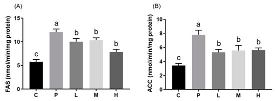 The protein concentration of each sample was determined using a Bio-Rad Protein assay kit (Bio-Rad Laboratories, Hercules, CA, USA). Fatty acid synthase (FAS) activity was measured as the malonyl coenzyme A-dependent oxidation of nicotinamide adenosine dinucleotide phosphate (NADP) in the presence of acetyl coenzyme A. acetyl-CoA carboxylase (ACC) was determined as described by Numa et al. [15]. Briefly, approximately 200 μg of unfrozen liver tissue was homogenized in 2 mL of 0.3 M mannitol, 100 mM 4-(2-hydroxyethyl)-1-piperazineethanesulfonic acid (HEPES), and 1 mM ethylene glycol tetra-acetic acid (EGTA) buffer (pH 7.2), and then centrifuged at 12,000× g for 10 min at 4 °C. The resulting post-nuclear supernatant (PNS) was analyzed for activities of the hepatic enzymes FAS and ACC. The reaction was run for 5 min at 37 °C, and enzyme activities were expressed as nmol/min/mg liver protein.