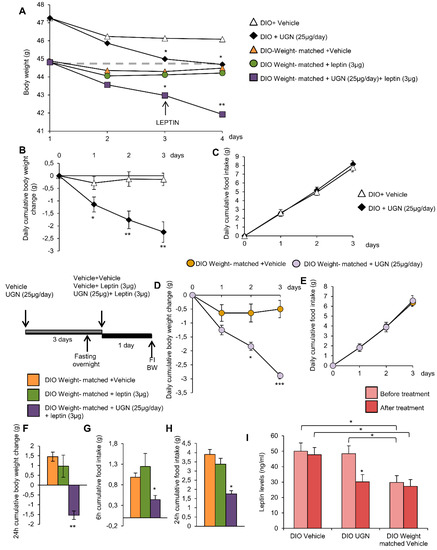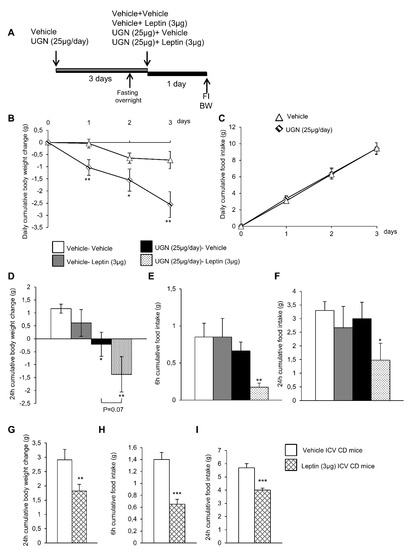 Schematic representation of the in vivo protocol (A). Effect of chronic Intracerebroventricular (ICV), uroguanylin (UGN) (25 µg/mouse) injection for four days in DIO mice on body weight (BW) (B) and food intake (FI) (C). Effect at 24 h of ICV leptin injection (3 µg/mouse) (the mice being pretreated with UGN (25 µg/mouse/four days) and submitted to fasting the night before leptin injection) body weight (D), and food intake at 6 h (E) and 24 h (F). Effect at 24 h of ICV leptin injection (3 µg/mouse) in lean mice fed a chow diet (C,D) on body weight (G) and food intake after 6 h (H) and 24 h (I). Values are represented as mean ± standard error of the mean (SEM); n = 8–17 animals per group. * p < 0.05; ** p < 0.01; *** p < 0.001 vs. vehicle.