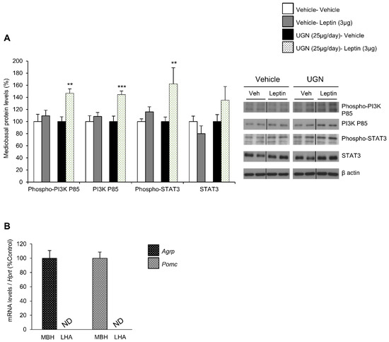 In DIO mice, the leptin receptor-induced intracellular signaling pathways have been shown to be impaired, including phosphatidylinositol 3-kinase (PI3K) and signal transducer and activator of transcription 3 (STAT3) pathways [12,13]. Therefore, after harvesting the hypothalamus of the different mice and groups, we have analyzed whether these hypothalamic signaling pathways could be affected by UGN. Interestingly, we were able to observe that the separated single UGN or leptin treatments in DIO mice models did not affect the levels of the total or phosphorylated form of PI3K, neither the ones of total and phosphorylated STAT3 (Figure 2A). However, the DIO mice pretreated with UGN during four days then injected with leptin exhibited increased mediobasal hypothalamic levels of the total and phosphorylated forms of PI3K, as well as a tendency to increased levels of phosphorylated STAT3 (Figure 2A). To evaluate the specificity of the isolation of the mediobasal hypothalamus (MBH), we have measured the expression of Agrp and Pomc—specific mediobasal hypothalamic markers—and interestingly, Agrp and Pomc mRNAs were only detected in the MBH and not in the lateral hypothalamus (LHA) (Figure 2B). All together, these data suggest that UGN restores hypothalamic leptin-induced signaling pathways in DIO mice.