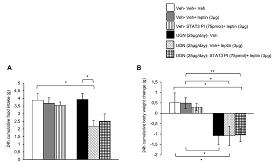 Evaluation of the blockade of STAT3 pathway in the response in 24 h cumulative food intake (A) and body weight change (B). The mice were perfused with UGN (25 µg/mouse) for four days, submitted to fasting overnight and then injected with leptin (3 µg/mouse), an inhibitor of STAT3 (STAT3 PI) (75 pmol/mouse), or by the combination leptin/STAT3 PI. Values are represented as mean ± SEM; n = 10–11 animals per group. * p < 0.05, ** p < 0.01 vs. vehicle.
