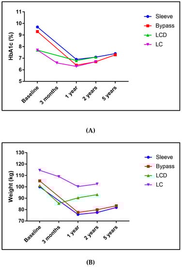 - Schauer, P.R.; Kashyap, S.R.; Wolski, K.; Brethauer, S.A.; Kirwan, J.P.; Pothier, C.E.; Thomas, S.; Abood, B.; Nissen, S.E.; Bhatt, D.L. Bariatric surgery versus medical therapy in obese patients with diabetes. N. Engl. J. Med. 2012, 366, 1567–1576. [Google Scholar] [CrossRef]
