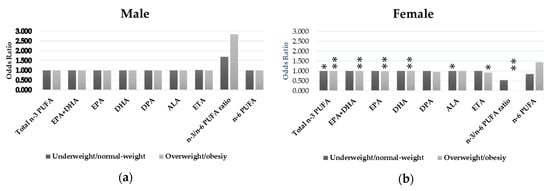 (a) Relationships between n-3 PUFAs intake and depressive states in males by weight status (* p-values under 0.05, ** p-values under 0.01), and (b) relationships between n-3 PUFAs intake and depressive states in females by weight status (* p-values under 0.05, ** p-values under 0.01).