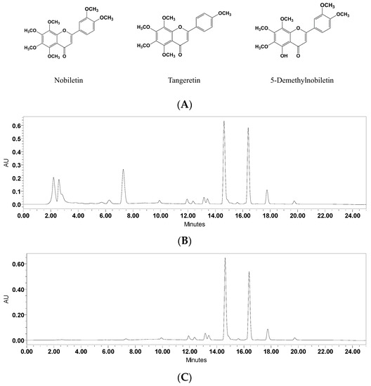 The structures and UPLC chromatograms of effects of solid-phase extraction (SPE) purification of nobiletin, tangeretin, and 5-demethylnobiletin (λ = 330 nm). (A) Structures of nobiletin, tangeretin, and 5-demethylnobiletin; (B) Crude extracts of Ougan peel; (C) SPE-refined polymethoxyflavone (PMF) enrichment extraction.
