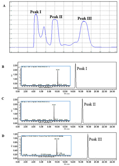 (A) The HSCCC separation spectrum of nobiletin, tangeretin, and 5-demetylnobiletin from the PMF fraction; (B) UPLC/UPLC-MS identification of purified Peak I, (C) Peak II, and (D) Peak III (λ = 330 nm).