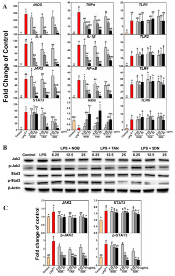 Key gene expression for three inflammation-related pathways, including the JAK2/STAT3 pathway, the NF-κB/IκBα pathway, and the TLR pathway, was investigated using qRT-PCR. As shown in Figure 4A, PMFs restrained LPS-induced upregulation of inducible nitric oxide synthase (iNOS), IL-6, JAK2, TNFα, IL-1β, and NF-κB and LPS-induced downregulation of IκBα. For TLR1, TLR2, TLR4, and TLR6, PMFs did not affect LPS-induced gene upregulation. Previous reports have shown that tangeretin treatment can downregulate the LPS-induced gene upregulation of iNOS, TNFα, IL-1β, and IL-6 [19]. Nobiletin can suppress LPS-induced NO release and was relevant in the downregulation of TNFα and NF-κB and the upregulation of IκB [17]. Tangeretin inhibited IL-1β, IL-6, and TNFα concentration in BV-2 medium and was found to be involved in NF-κB/IκBα pathway regulation [18]. Our results are consistent with previous reports and indicated that PMFs prevented the expression of the JAK2 and STAT3 genes. Among the three monomers, tangeretin and 5-demethylnobiletin repressed both JAK2 and STAT3 gene expression, while nobiletin suppressed JAK2 gene expression but had no effect on STAT3 expression.