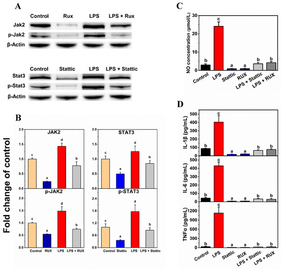 Preliminary verification by the Jak2 inhibitor and the Stat3 inhibitor. (A) Protein expression detected by western blot assay; (B) Relative protein expression of Jak2, p-Jak2, Stat3, and p-Stat3; (C) NO release detection; and (D) ELISA detection of IL-1β, IL-6, and TNFα. The concentrations of treatments were LPS (0.1 μg/mL), Rux (300 nM), and Stattic (10 μM). Lower-case letters were used to indicate the significance of numerical differences in the same graph. Columns following the same letter indicate the insignificant differences between the groups. Columns without the same letter indicate significant differences between groups (p < 0.05 according to Tukey’s tests). Letter ordering stated from ‘a’ and sorted by column values from small to large.