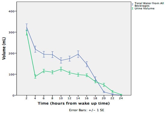 Significant differences were observed in total water intake from all beverages and urine volume in 6 h periods throughout the day. A peak on the beverage curve was observed in the morning and in the evening 6 h period, while the lowest values were observed at the end of the day. Urine volume was positively correlated with total beverages consumption (r = 0.387, p < 0.001) and total water intake (r = 0.392, p < 0.001). Only during the night period was the excreted urine volume greater than the total volume of consumed beverages (Figure 1). This was expected, because the subjects were not consuming any beverages during their sleeping period, resulting only in urine excretions in the morning.