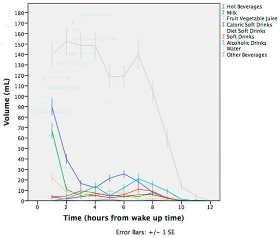A significant effect of time was present in the intake of water (F = 32.582; p < 0.001), hot beverages (F = 90.876; p < 0.001), milk (F = 17.063; p = 0.003), fruit and vegetable juices (F = 3.785; p = 0.045), and alcoholic drinks (F = 7.075; p = 0.002) for the 6 h periods. Water was the most preferred beverage and consumed in larger volumes during the day compared to the other seven categories of beverages. A peak in the intake of hot beverages and milk was observed in the morning 6 h period (Figure 2). Moreover, a peak on the curve of alcoholic drinks was observed in the evening 6 h period (Figure 2). The intake of other categories of beverages was spread during the day with no significant differences. Water Intake in the morning interval correlated with urine osmolality in the morning, afternoon, and evening interval (r = −0.169, p = 0.049, r = −0.275, p < 0.001; r = −0.216, p = 0.014 respectively) and Urine Specific Gravity (USG) in the afternoon interval (r = −0.260, p = 0.003), while water intake in the afternoon interval was correlated with urine osmolality in the afternoon and evening interval (r = −0.171, p = 0.050; r = −0.216, p = 0.014) and USG in the evening interval (r = −0.231, p = 0.008).