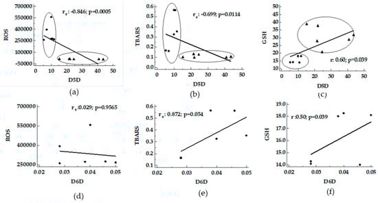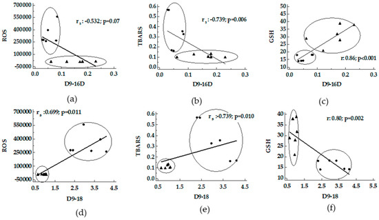 A negative correlation between D9-16D versus ROS and TBARS supported by a positive correlation with GSH was shown (Figure 2, panel a–c). On the contrary, a positive correlation between D9-18D versus ROS and TBARS supported by a negative correlation with GSH was shown (Figure 2, panel d–f).