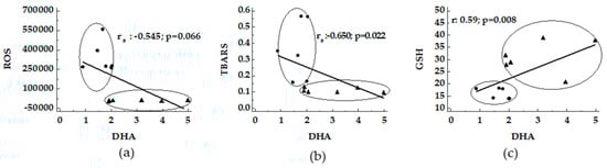 A negative correlation between DHA and ROS and TBARS supported by a positive correlation with GSH was detected (Figure 3).