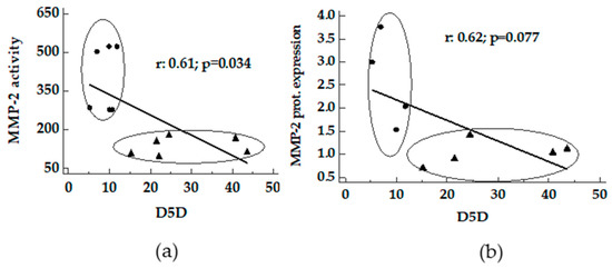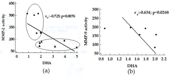A negative correlation between DHA versus MMP-2 activity was found (Figure 6, panel a). In addition, the same trend was detected for MMP-9 activity in MCD rats (Figure 6, panel b).