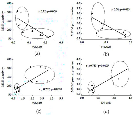 A positive correlation between D5D and D9-16D and D9-18D versus activity and protein expression of MMP-2 was found in livers from MCD and Obese Zucker rats (Figure 4 and Figure 5). In MCD rats a good correlation between D9-18D versus protein content of MMP-9 was detected (rs 0.99, p < 0.0001).