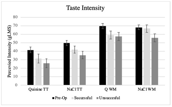 Across all participants, the intensity of 1mM quinine on the tongue tip averaged strong (35.1 ± 2.65), and 1M NaCl averaged between strong and very strong (44.0 ± 2.25). Comparatively, water averaged near barely detectable (2.31 ± 0.56). Upon visual inspection, patients who reported intensities to water on the tongue tip above “weak” did not report having a dysgeusia or that things did not taste right. Whole mouth NaCl averaged between strong and very strong (44.03 ± 2.25) and quinine averaged above very strong (63.80 ± 2.46). Independent of the perceived intensity of remembered sensations, the perceived intensity of these tastants showed significant correlation with the bitterness of PROP. The r values ranged from 0.23, p < 0.05 for quinine on the tongue tip to 0.45, p < 0.01 for whole mouth quinine. Figure 1 shows the average intensities of tastant and location by surgery group defined by %EWL. In a repeated measure ANCOVA, controlling for covariates, there was a significant effect between pre- and post-surgical groups (F(1,90) = 5.86, p < 0.05)), with the post-surgery group reporting lower intensities across all tastants. Similar findings were seen in ANCOVA, with a taste factor averaged across the two tastants at tongue tip and whole mouth, explaining 70% of the variance across all of the participants and good internal reliability (α = 0.83). Further examination by groups defined by %EWL also showed significant effects on taste intensity ratings (F(2,89) = 3.86, p < 0.05), with significant differences between the pre-operative group and the unsuccessful group (p < 0.01). The unsuccessful group reported lower intensities than did the pre-operative group. Similar results were identified, whether grouping by %EWL or %WL. The total number of chemosensory risk factors did not explain significant variation in taste intensity.