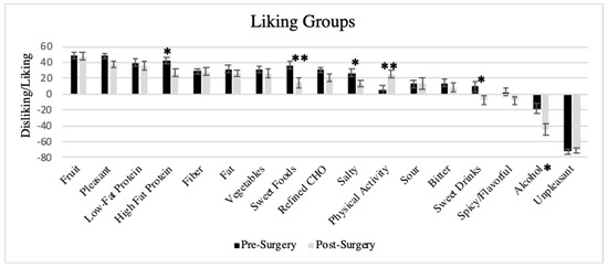 Average liking ± SEM for nutritional, sensory, and non-foods among women with morbid obesity awaiting bariatric surgery (pre-surgery) versus women 1-year post-bariatric surgery, listed from most to least liked; * p ≤ 0.05; ** p < 0.01.