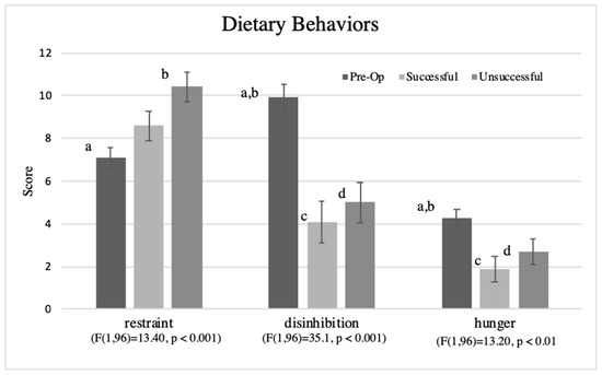Average scores on restraint disinhibition, and hunger among women with morbid obesity before bariatric surgery (pre-op) and those 1-year post-surgery, defined by percent excess weight loss into successful (≥65%) and unsuccessful (<33%) weight loss groups. Unlike letter notations within a variable (a versus b; a,b versus c,d) = significant difference, all p’s < 0.05).