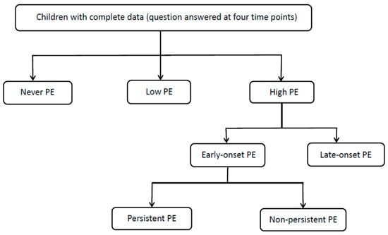 The same question was asked about the child at three additional timepoints (2, 4.5 and 5.5 years) and the answers were coded in the same way. For the longitudinal classification, never picky eating was defined as a score of 0 at all time points; low picky eating as a score of 1 at all time points or 0 or 1 at three points and 2 at any one time point; high picky eating as a score of 2 at two or more time points. High picky eating was further subdivided into early-onset (score of 2 first occurring at either age 2 or 3 years) or late-onset (score of 2 first occurring at age 4.5 or 5.5 years). Early-onset picky eating was further subdivided in to persistent (score 2 at least three times between 2 and 5.5 years and non-persistent (did not score 2 after the age of 3 years) [] (Figure 1).