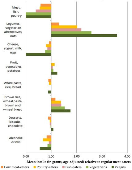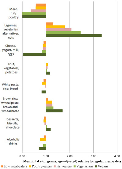 15. Bradbury, K.E.; Tong, T.Y.N.; Key, T.J. Dietary Intake of High-Protein Foods and Other Major Foods in Meat-Eaters, Poultry-Eaters, Fish-Eaters, Vegetarians, and Vegans in UK Biobank. Nutrients 2017, 9, 1317. [Google Scholar] [CrossRef]