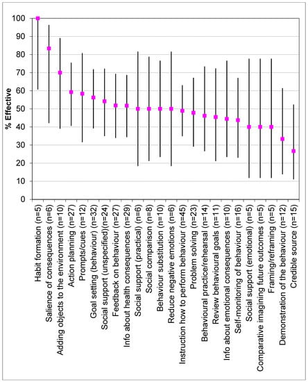 In parallel with similar reviews [,], we calculated a percentage effectiveness ratio to identify the BCTs associated with effective interventions, whereby the number of times the technique was a component of an effective intervention divided by the total number of times the technique was a component of an intervention. An effective intervention was defined as one where the change in one or more nutrition outcomes was positive and statistically significantly different from baseline, compared with control, or if no control comparator, compared with another active intervention. Only the BCTs which were identified in a minimum of five studies were included in the analysis to avoid inflation of results from those BCT’s used on few occasions. A plot of effectiveness with 95% credible intervals from a Bayesian approach (beta posterior from a binomial likelihood and conjugate uniform beta prior) was implemented. As there were 24 BCTs that were identified in at least five studies, an overall test of significance was carried out using a contingency table between type and number of BCTs and effectiveness using Monte–Carlo exact chi-squared test (SPSS version 25, Armonk, New York, USA).