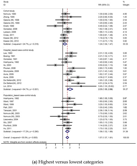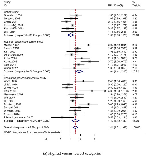 A total of 5 cohort studies and 19 case-control studies with 9726 cases were included to identify the association between red meat intake and the risk of gastric cancer. Figure 2 presents the adjusted RRs for each study and pooled RRs for relevant or all studies. RRs were calculated by comparing the highest red meat consumption with the lowest red meat consumption (Figure 2a). As shown in Figure 2a, the subjects with a higher intake of red meat had a 41% higher risk of gastric cancer in the meta-analysis (RR, 1.41; 95% CI, 1.21–1.66), and we found statistically significant heterogeneity (p < 0.001; I2, 69.6%). According to the Figure S4a, publication bias was discovered on Begg’s test (p = 0.022) and Egger’s test (p = 0.076).