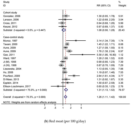 A total of 4 cohort studies and 13 case-control studies were included for the dose–response meta-analysis of red meat consumption and gastric cancer risk. As shown in Figure 2b, the subjects had a 26% higher risk of gastric cancer per 100 g/day increment in red meat consumption (RR, 1.26; 95% CI, 1.11–1.42), and we found statistically significant heterogeneity (p < 0.001; I2, 70.3%). According to Figure S4b, publication bias was not discovered on Begg’s test (p = 0.472) and Egger’s test (p = 0.315).