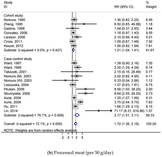 A total of 7 cohort studies and 11 case-control studies were included for the dose–response meta-analysis of processed meat consumption and gastric cancer risk. As shown in Figure 3b, the subjects had a 72% higher risk of gastric cancer per 50 g/day increment in processed meat consumption (RR, 1.72; 95% CI, 1.36–2.18), and we found statistically significant heterogeneity (p < 0.001; I2, 72.1%). According to Figure S5b, publication bias was discovered on Begg’s test (p = 0.086) and Egger’s test (p = 0.039).