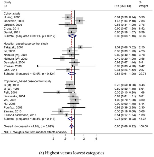 In the subgroup analysis (Table 2), a negative association was detected when the analysis was restricted to study quality score ≥7 (high-quality) (RR, 0.80; 95% CI, 0.68–0.93) and case-control studies (RR, 0.77; 95% CI, 0.66–0.91). On the other hand, there was no significant association in cohort studies group (RR, 0.85; 95% CI, 0.63–1.16) and quality score <7 (low-quality) (RR, 0.80; 95% CI, 0.54–1.18). When stratified by sex, a negative relation was observed on women group (RR, 0.67; 95% CI, 0.52–0.87). In the subgroup analysis by geographic region, negative association was only detected on Asian populations (RR, 0.70; 95% CI, 0.57–0.85), and was not detected on European, North American, and Latin American populations. Negative association was also observed in studies adjusted for total energy intake (RR, 0.80; 95% CI, 0.64–1.00) and socioeconomic status (RR, 0.80; 95% CI, 0.67–0.96), but not observed in other adjustments, which were BMI, smoking, alcohol drinking, vegetable intake, fruit intake, salt intake, and H. pylori.