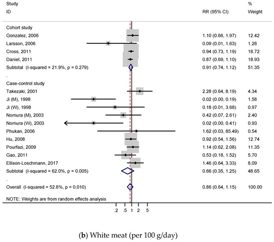 A total of 5 cohort studies and 14 case-control studies with 9896 cases were included to investigate the relationship between white meat intake and gastric cancer, and RRs were reported in Figure 4a. For all studies, the summary RR indicated a 20% decreased risk of gastric cancer (RR, 0.80; 95% CI, 0.69–0.92), which contrasted with the result of red meat or processed meat. We identified low heterogeneity (p = 0.023; I2, 41.9%) and no publication bias both on Begg’s test (p = 0.131) and Egger’s test (p = 0.116), according to Figure S6a.
