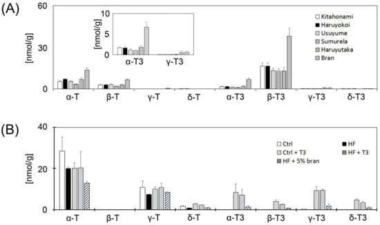 To prevent HF diet-induced obesity and its related brain antioxidant network dysfunction, we treated control and HF diet fed mice with T3s. Furthermore, to clarify the preventative effect of natural foods, we fed bran, which contains the epidermis and germ, to the HF diet group. In our study, bran was high in α- and γ-T3 compared to the 5 other whole grain wheat samples (Figure 2A). It is well known that rice bran and barley germ are also high in T3s []. Prior to initiating the present study, we confirmed the VE contents of all five foods before and after heat-drying. There were no significant differences in VE contents in each food before and after heat-drying (0, 15, 30, 45 and 60 min heat drying), and thus each food was heated for 30 min for 100 °C. To prevent oxidation, food samples were stored in a fridge in an air-sealed, light-shielded container, and small portions of the foods were provided to the animal cages. Since all whole grain wheat, bran and control pellets were made from natural plants including corn, soy flour and other cereals, the various mouse diets contained a relatively high β-T3 content.