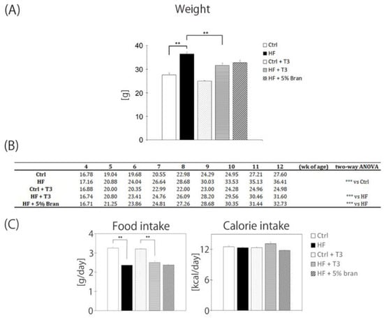 Mice were fed five different diets from 4 to 12 weeks of age. The body weight of all mice gradually increased in a time-dependent manner (Figure 3B). Treatment with the HF diet significantly increased body weight, and co-treatment with T3s significantly inhibited the body weight gain (Figure 3A). There were significant interactions of body weight gain between the control vs HF, HF vs HF + T3, and HF vs HF + 5% bran for the 8-week feeding period (Figure 3B). The amount of food intake of the two HF diet-treated groups was significantly lower than the other two control diet-treated groups in the presence or absence of T3. However, the calorie intake did not significantly differ among the groups (Figure 3C).