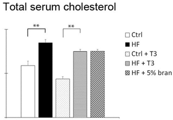 We measured total serum cholesterol levels using a commercial kit. As shown in Figure 4, the cholesterol level of the HF group was significantly higher than that of the control. Co-treatment with T3s or 5% bran tended to decrease the serum cholesterol level in the HF group. However, there were no significant differences in the serum cholesterol level in the presence or absence of T3s.