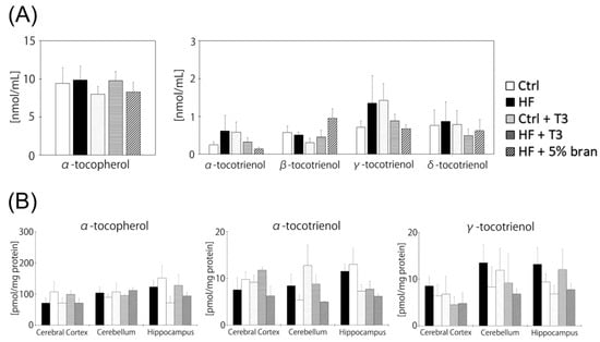 Measurement of vitamin E contents in serum (A) and cerebral cortex, cerebellum and hippocampus (B). Control (Ctrl, n = 8), high fat (HF, n = 7), control + T3s (Ctrl + T3, n = 8), HF + T3 (n = 8), HF + 5% bran (n = 8). The data was analyzed using Tukey-Kramer’s method.