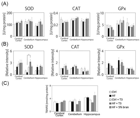 Antioxidant enzyme activities and the TBARS assay revealed no significant differences among samples, except in certain regions of the brain. In HF diet-treated groups, treatment with T3s significantly increased SOD protein expression in the cerebellum compared to the untreated group. On the other hand, no significant differences in the cerebral cortex and hippocampus were observed among all groups (Figure 6B). However, SOD and GPx protein expressions in the cerebral cortex tended to increase in the HF-treated group compared to the controls. Furthermore, SOD protein expression in the hippocampus also tended to increase in the HF-treated group compared to the control. These results indicated that the production of oxidative stress was slightly increased in the brain by HF diet feeding. However, the ratio of oxidative stress production by the HF diet was small. Finally, we determined p-mTOR and pAkt protein expressions, as these proteins are upstream in the signaling pathway of the oxidative response in living tissues, and are related to autophagy (Supplemental Figure S1). However, there were no significant differences among the samples.