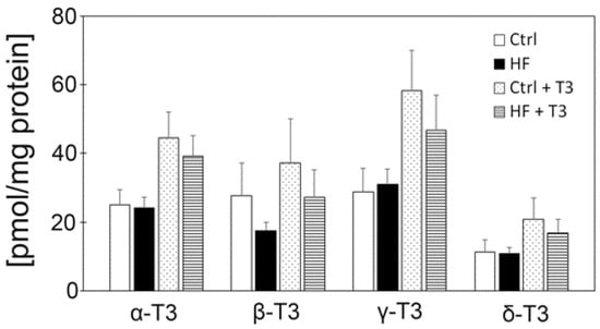 T3s have neuroprotective effects in vivo [] and in vitro [,]. To clarify the effects of T3s on the brains of HF-treated mice, we measured VE contents in the serum and different brain regions. We detected α- and γ-T3s in all samples, and the levels of VE did not significantly differ between all samples (Figure 5). Previously, we confirmed that α- and γ-T3 levels tended to increase in the livers of T3s-treated mice (Figure 7). These results and our previous data indicate that T3s may not reach the brain. However, VE has been shown to improve liver function in conditions such as non-alcoholic steatohepatitis []. Thus, the anti-obesity effect of T3s may be related to improvements in liver function.