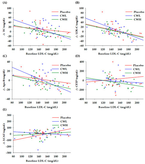 The correlation between baseline LDL-C levels and changes in lipid parameters after 8 weeks is shown in Figure 2. The changes in TC showed a negatively significant correlation with baseline LDL-C levels in the CWL (r = −0.516, p = 0.010) and CWH (r = −0.471, p = 0.015) groups (Figure 2A), however, there was no significant correlation in the placebo group (r = 0.190, p = 0.373). The changes in LDL-C were significantly correlated with baseline LDL-C levels in the placebo (r = −0.441, p = 0.031), CWL (r = −0.623, p = 0.001), and CWH (r = −0.586, p = 0.002) groups (Figure 2B). The changes in apoB were also significantly correlated with baseline LDL-C levels in the CWL (r = −0.651, p = 0.001) and CWH (r = −0.442, p = 0.031) groups (Figure 2C). There was no significant correlation between changes in CETP and baseline LDL-C levels (Figure 2D). The changes in LCAT were significantly correlated with baseline LDL-C levels only in the placebo group (r = 0.462, p = 0.027) (Figure 2E).