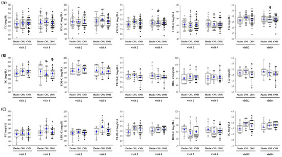The lipid profiles of the participants are given in Figure 3A. VLDL-C (p = 0.022) and TG (p = 0.022) levels were higher in the CWL-treated group than in the placebo group and significantly reduced after 8 weeks. TC and LDL-C levels showed a decreasing trend after 8 weeks in both the high-level and low-level groups; however, there were no significant differences between the groups. Relative to the initial baseline LDL-C recorded, subjects were divided into two subgroups; high-level LDL-C ≥ 150 mg/dL (n = 33) and low-level LDL-C < 150 mg/dL (n = 41). In the high-level LDL-C subgroup, TC levels in the subjects treated with CWL (p = 0.012) or CWH (p = 0.021) were significantly reduced after 8 weeks compared to the levels in placebo-treated subjects (Figure 3B). In addition, the group * time effect showed that TC levels (p = 0.036) were significantly different among the three groups. LDL-C levels in the CWL group (p = 0.032) were significantly reduced after 4 weeks, but there were no statistically significant differences until 8 weeks. However, in the low-level LDL-C subgroups, there were no other statistically significant differences between the groups (Figure 3C).