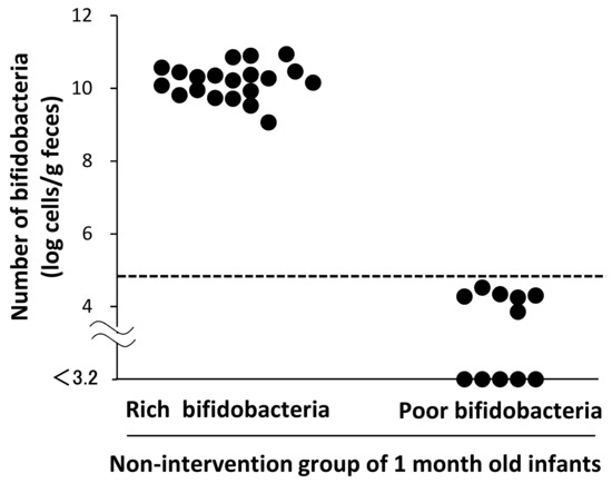 Fecal bifidobacterial counts in the non-intervention control group at 1 month of age. The horizontal dotted line indicates the representative value of the lower limit of the 95% confidence interval of the bifidobacterial counts in Japanese term infants [30].