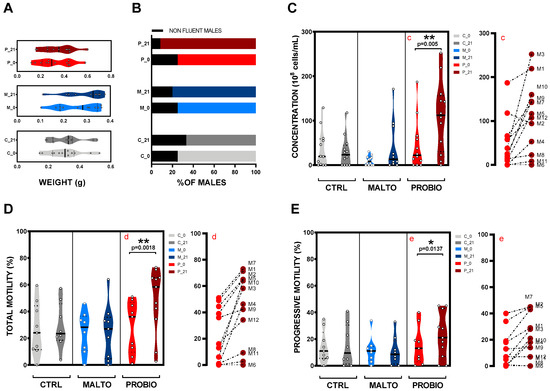 3.1. Effects of Probiotic Mixture Supplementation on Total Body Weight and Spermiation Capacity