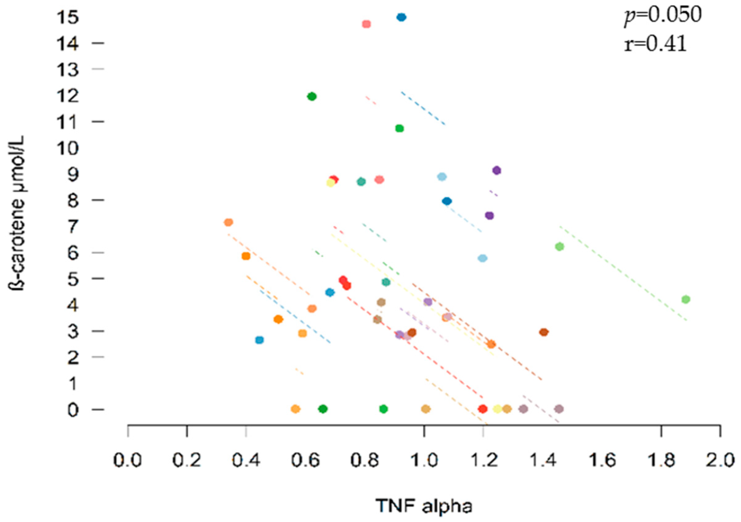 - Muzáková, V.; Kand’ár, R.; Meloun, M.; Skalický, J.; Královec, K.; Záková, P.; Vojtísek, P. Inverse Correlation Between Plasma Beta-Carotene and Interleukin-6 in Patients with Advanced Coronary Artery Disease. Int. J. Vitam. Nutr. Res. 2010, 80, 369–377. [Google Scholar] [CrossRef] [PubMed]