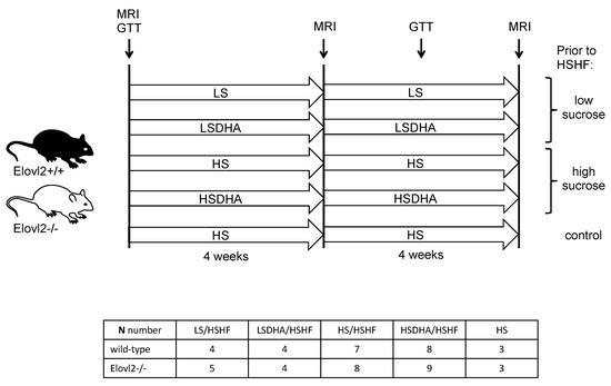 Experimental set-up. Wild-type and Elovl2 -/- mice were kept on low-sucrose (LS) or low-sucrose DHA-enriched diet (LSDHA) or on high-sucrose (HS) or high-sucrose DHA-enriched diet (HSDHA) for four weeks, followed by four weeks of high-sucrose, high-fat diet (HSHF) feeding. Control groups were kept on high-sucrose diet (HS) for eight weeks. Magnetic resonance imaging (MRI) was performed to measure fat and lean mass at the start point of the experiment, after four weeks pre-treatment and at the end of the experiment after four weeks of high-sucrose, high-fat diet. Glucose tolerance tests (GTT) were performed at the starting point and after six weeks of treatment (four weeks of pre-treatment and two weeks of high-sucrose, high-fat diet (HSHF).