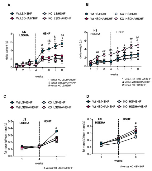 Sucrose content in DHA-enriched diet has an impact on gaining of weight by Elovl2 -/- mice. (A) Development of body weight in wild-type and Elovl2 -/- animals fed low-sucrose diet (LS) or low-sucrose DHA-enriched diet (LSDHA), followed by high-sucrose, high-fat diet (HSHF). (B) Body weight of animals fed high-sucrose (HS) or high-sucrose DHA-enriched diet (HSDHA) followed by high-sucrose, high fat diet (HSHF). (C) Obesity index for wild-type and Elovl2 -/- mice, presented as ratio of fat mass (g) to lean mass (g), at the beginning of the treatment, after four weeks of low-sucrose (LS) or low-sucrose DHA-enriched diet (LSDHA), and after additional four weeks of HSHF diet. (D) Obesity index at the beginning of the treatment, after four weeks of high-sucrose (HS) or high-sucrose DHA-enriched diet (HSDHA), and after four weeks of high-sucrose, high-fat diet (HSHF). Results shown are means of 4–9 mice ± SEM. Statistical significances are shown between groups * p < 0.05 and ** p < 0.01. # p < 0.05 and ## p < 0.01. & p < 0.05 and && p < 0.01.