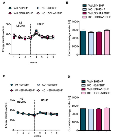 The effect on body weight gain after four weeks of HSHF diet could be explained by an increased food consumption in these mice. However, even though all experimental groups showed a temporary increase in food intake during the first week of HSHF diet, there was no significant difference in energy intake (Figure 3A,C) or cumulative food consumption (Figure 3B,D).