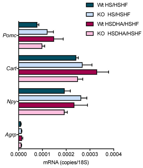 Hypothalamic mRNA expression of neuropeptides involved in the control of food intake is not affected by supplementation of DHA with high sucrose content. Relative hypothalamic gene expression of the orexigenic peptides NPY and AGRP and the anorexigenic peptides POMC and CART in wild-type and Elovl2 -/- mice fed high-sucrose (HS) or high-sucrose DHA-enriched diet (HSDHA) followed by high-sucrose, high-fat diet (HSHF) feeding. mRNA levels are shown relative to 18S expression. Results shown are means of four mice ± SEM.