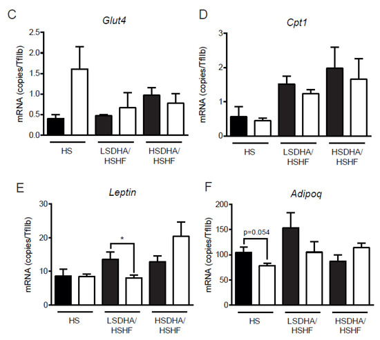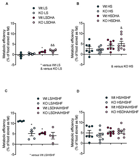 Metabolic efficiency, expressed as percent of food stored as fat, was calculated based on the energy intake and fat mass data for all experimental groups after four weeks of pre-treatment (LS, LSDHA, HS, HSDHA) and after four weeks of HSHF diet. During the pre-treatment period, DHA supplementation with low sucrose (LSDHA) slightly increased food utilization in both wild-type and Elovl2 -/- mice as compared to their littermates kept on LS diet (Figure 5A). Pre-treatment with HS diet increased metabolic efficiency in both genotypes (Figure 5B), pointing towards increased lipogenesis and fat accumulation under these conditions of high sucrose availability. When DHA was supplemented together with high-sucrose diet (HSDHA), Elovl2 -/- mice displayed a more efficient deposition of energy as compared to the DHA-deficient mice fed only HS diet (Figure 5B), reflecting the changes in body weight observed under these conditions (Figure 2B). A positive effect of sucrose on metabolic efficiency was also observed in both genotypes of the control groups maintained on HS diet for eight weeks (Table 2), while the Elovl2 -/- mice showed a lower metabolic efficiency than their wild-type littermates. Four weeks of HSHF diet feeding significantly increased the metabolic efficiency, especially in wild-type mice pretreated with LS diet (Figure 5C), which is in line with the observed differences in body weight gain (Figure 2A). There was no difference in the metabolic efficiency between the experimental groups upon HSHF treated after four weeks of HS pretreatment (Figure 5D).