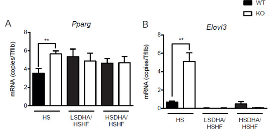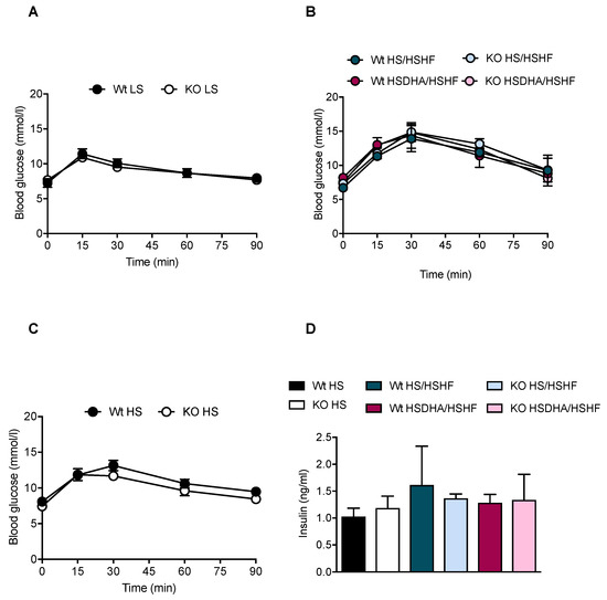 However, Elovl2 -/- animals fed the HS diet (low fat) for eight weeks tended to be more glucose tolerant than wild-type mice and showed lower levels of glucose already after 30 min after the glucose administration (Figure 6C). The analysis of serum insulin levels in the fed stage of animals, performed at the end of experiment, did not show any significant difference between the experimental groups (Figure 6D). There was no significant difference in fasting glucose levels between Elovl2 -/- and wild-type mice maintained on LS diet at the start of the experiment (Supplementary Figure S2A). However, after four weeks of LSDHA diet, the Elovl2 -/- mice showed a tendency towards reduced glucose levels compared with wild-type littermates (Supplementary Figure S2B). After an additional four weeks of HSHF diet, the glucose levels were lower in the Elovl2 -/- mice pretreated with DHA than in wild-type mice and significantly lower than in Elovl2 -/- mice that had not been supplemented with DHA (Supplementary Figure S2C), despite increased body weight in these animals.