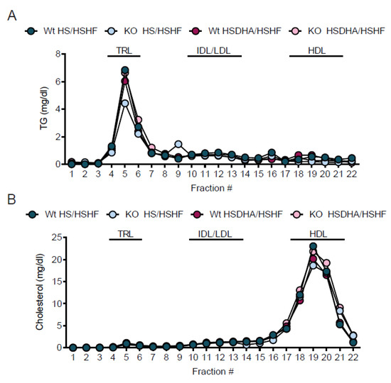 Triglyceride lipoprotein profile in Elovl2 -/- mice is reversed to wild-type levels after high-sucrose DHA-enriched (HSDHA) treatment. Serum lipoprotein triglyceride (A) and cholesterol (B) profiles were determined on pooled serum from four to five mice per group of wild-type and Elovl2 -/- mice fed high-sucrose (HS) or high-sucrose DHA-enriched diet (HSDHA) followed by high-sucrose, high-fat (HSHF) diet. Fractions 4–6 represent TG-rich lipoproteins (TRL), fractions 10–15 low density lipoprotein and mainly remnant particles (LDL), and fractions 16–23 represent high density lipoproteins (HDL).